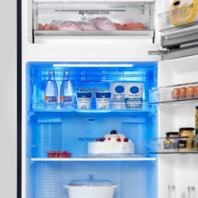 The Extra Cool Zone is ideal for cooling drinks or food quickly. The antibacterial cover cools items at approx. 2°C, slightly colder than the regular fridge compartment at approx. 4°C.