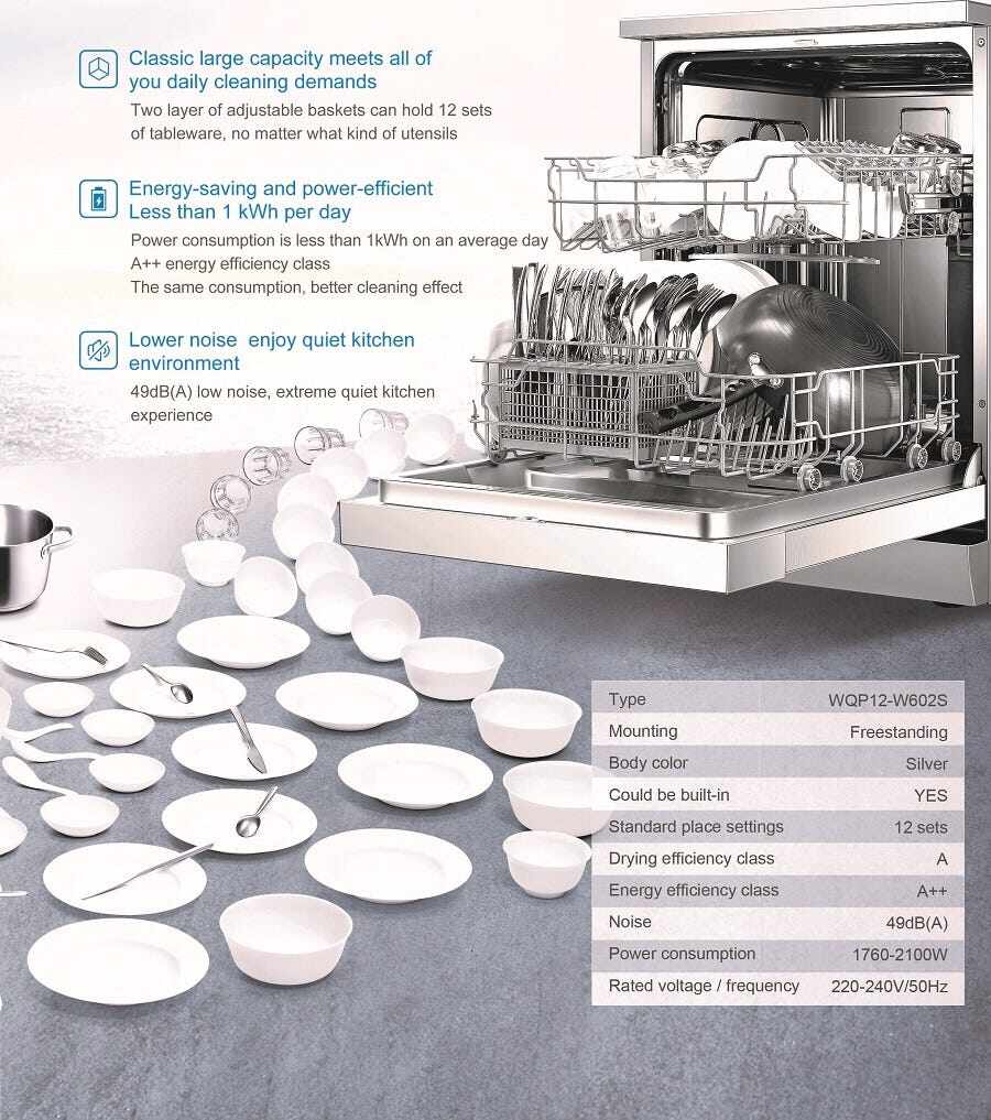 MountingFreestandingBody ColourSilverFull Size12 place settingsNoise Level49 DbaProduct Consumption1760-2100W