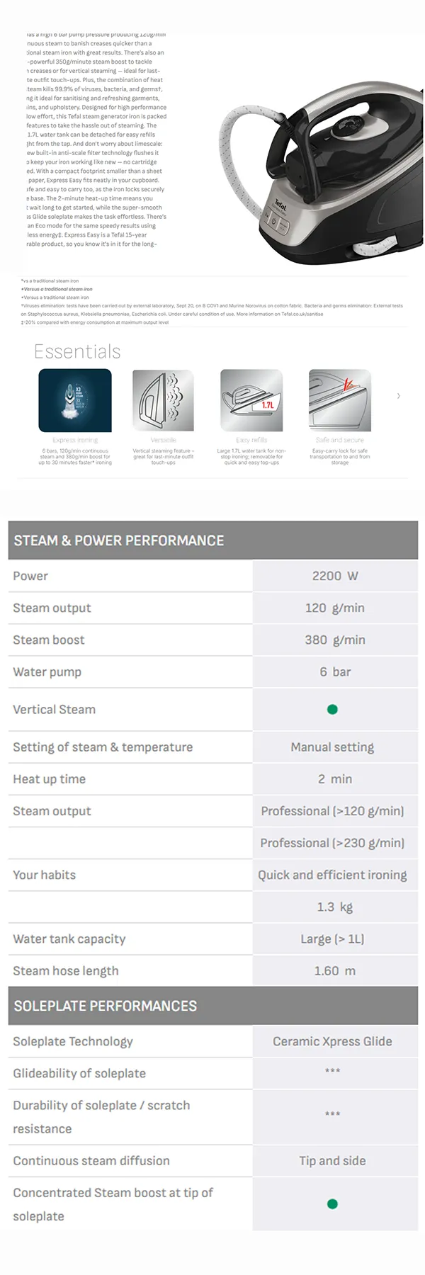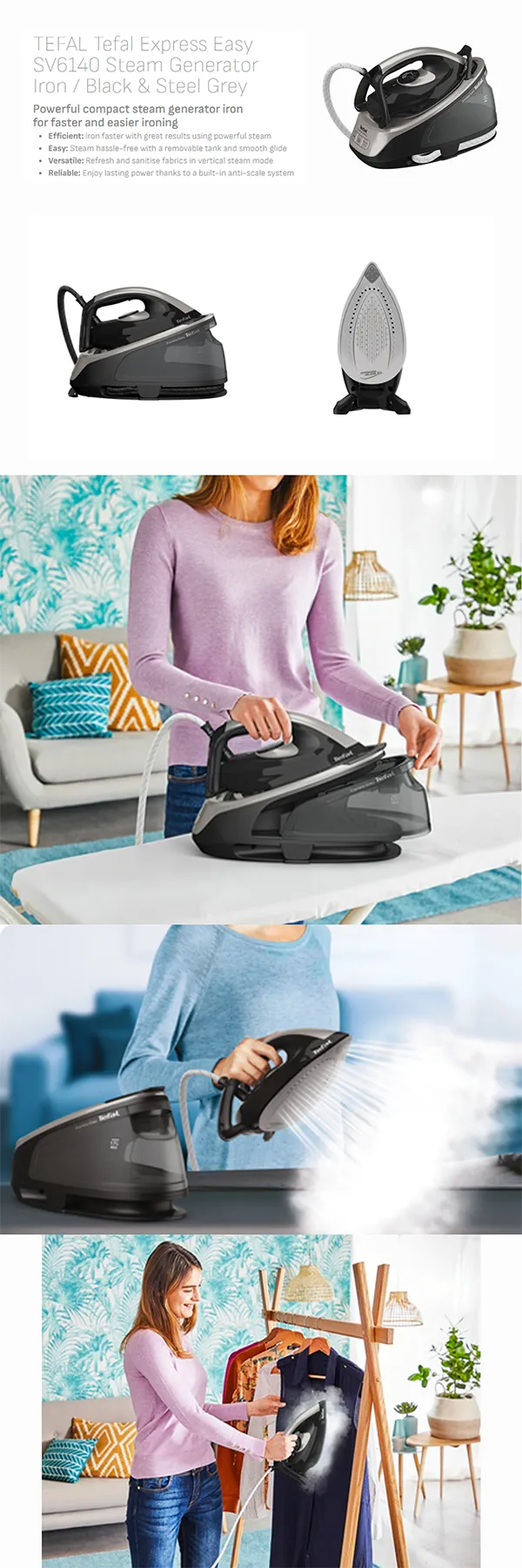 Specifications of Tefal 2200W Express Easy Steam Generator Iron SV6140 | 6 bar pump | Vertical steaming feature | Ceramic Xpress Glide soleplate | Eco mode