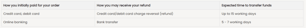 When will I receive my refund? Depending on the mode of payment you’ve selected upon transaction, you will be offered mode of refund based on your payment mode, which will take between 1 to 15 working days depending on our partnering banks. Please consult the table below for details.